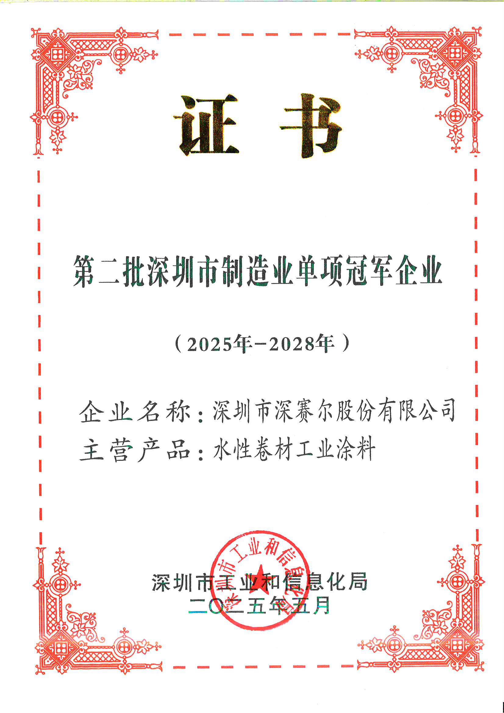 深圳市制造業(yè)單項冠軍企業(yè)證書